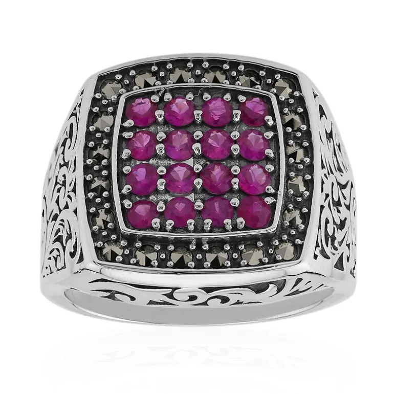 Dieser auffällige Ring präsentiert eine strahlende Ansammlung von 16 Madagaskar-Rubinen im Rundschliff mit insgesamt 0,48 Karat, die von einem Rahmen aus 20 schimmernden österreichischen Markasiten im Rundschliff umhüllt sind. Der aus hochwertigem 925er Sterlingsilber gefertigte Ring mit einem Gewicht von 7,1 Gramm strahlt Opulenz aus und wird durch das filigrane Design an den Seiten wunderbar ergänzt. Mit einem Gesamtkaratgewicht von 0,76 Karat und einer kühnen Silhouette von 21×19 mm ist er ein echter Blickfang. Dieses Schmuckstück eignet sich sowohl für formelle Anlässe als auch für einen Hauch von zeitloser Eleganz im Alltag und wird mühelos zu einem geschätzten Bestandteil jeder Schmucksammlung.