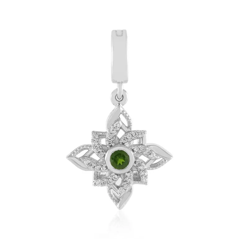 Ein bezauberndes Accessoire mit einem sattgrünen russischen Diopsid in der Mitte, gefasst in schlichtem Silber. Dieser 27×16 mm große Anhänger besticht durch sein elegantes Blumendesign, das jedem Outfit einen Hauch von Raffinesse verleiht. Der Varioclip ermöglicht ein vielseitiges Tragen, wodurch er sowohl für legere als auch für formelle Anlässe geeignet ist. Kombinieren Sie ihn mit Ihrer Lieblings-Silberkette für einen auffälligen Look.