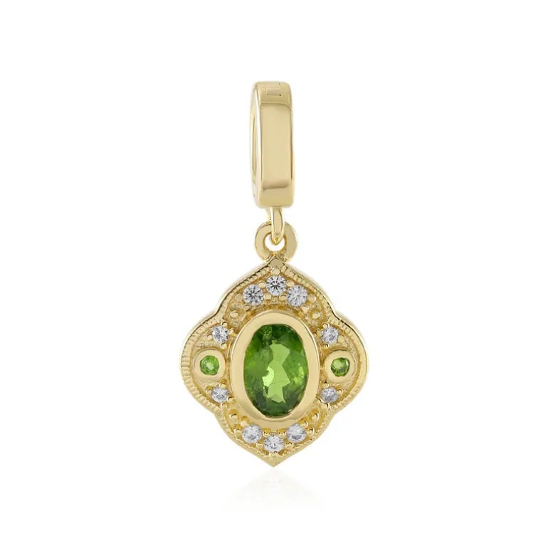 Dieser exquisite Anhänger zeigt einen üppigen russischen Diopsid als Mittelstein, umgeben von weiteren Diopsiden und funkelnden Zirkonen aus Kambodscha. Das Design aus vergoldetem 925er Sterlingsilber verleiht jedem Outfit Eleganz und Flair. Die satten Grüntöne des Anhängers passen sowohl zur Abendgarderobe als auch zur Freizeitkleidung und lassen sich wunderbar mit neutralen Tönen und gewagten Accessoires kombinieren.