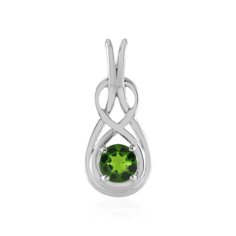 Entdecken Sie die lebendige Anziehungskraft dieses charmanten Anhängers, der einen üppigen russischen Diopsid von 0,457 Karat präsentiert. Der runde Schliff des Edelsteins, der in elegantem platiniertem 925er Sterlingsilber gehalten wird, strahlt aus dem modernen, verschlungenen Design. Mit den Maßen 20×9 mm ist der Anhänger eine exquisite Ergänzung für jede Schmucksammlung. Er eignet sich sowohl für den Alltag als auch für den eleganten Abend und kann von einem legeren Tagesoutfit bis hin zu einem raffinierten Abendlook getragen werden.