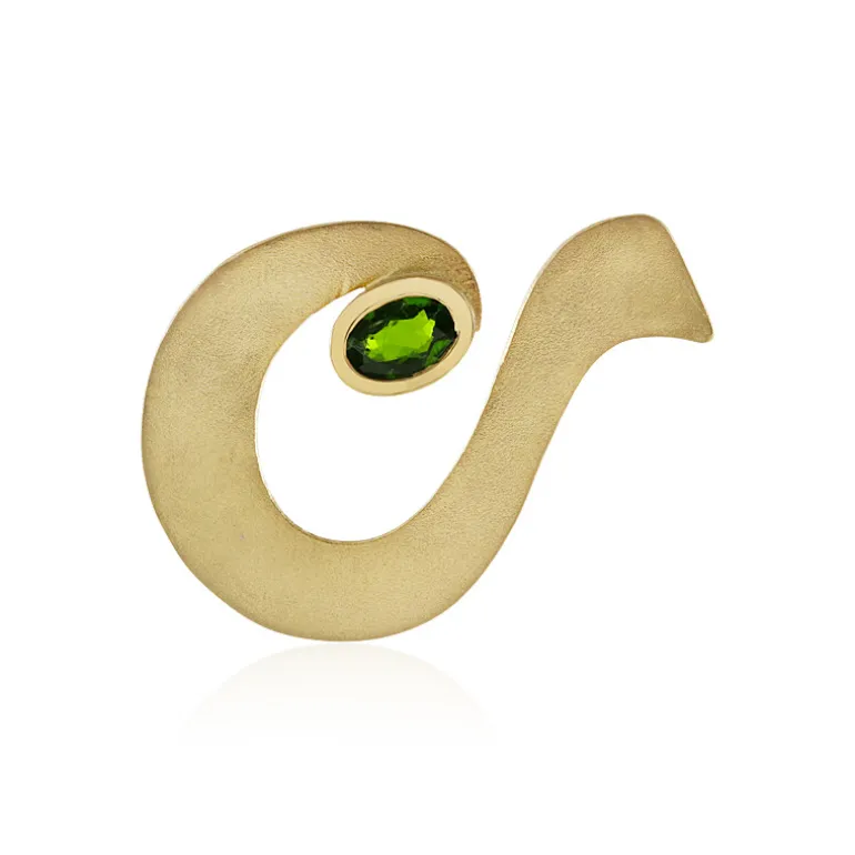 Schmücken Sie Ihr Dekolleté mit dieser modernen Mischung aus Glamour und natürlichem Charme. Dieser Anhänger aus vergoldetem 925er Sterlingsilber enthält einen leuchtenden russischen Diopsid von 0,387 Karat, der elegant in einem ovalen Schliff gefasst ist. Die einzigartige Spiralform des Anhängers und die matte Oberfläche bilden einen atemberaubenden visuellen Kontrast zum leuchtenden Grün des Edelsteins. Dieses Schmuckstück ist perfekt, um einem Freizeitoutfit ein subtiles Statement hinzuzufügen oder einen Abendlook mit einem Hauch von Raffinesse zu ergänzen.