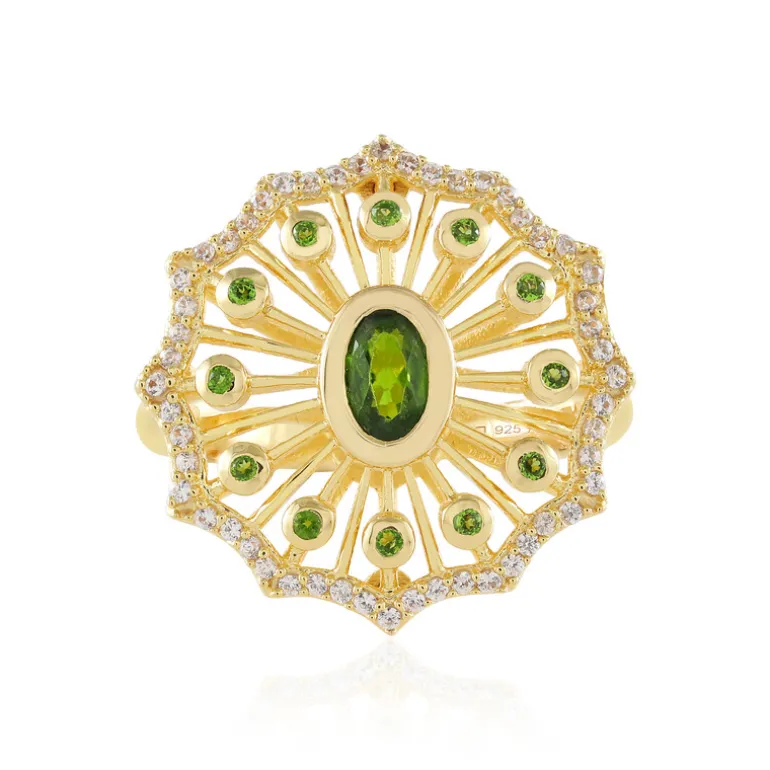 Entdecken Sie die Anziehungskraft dieses atemberaubenden Rings aus russischem Diopsid mit einem ovalen Mittelstück und 12 Akzenten im Rundschliff. Die Edelsteine glänzen in einer Fassung aus vergoldetem 925er Sterlingsilber und werden von Zirkonen aus Kambodscha ergänzt. Dieser 25×21 mm große Ring eignet sich perfekt zum Ausgehen oder für einen eleganten Tageslook und verleiht jedem Outfit einen Hauch von Eleganz. Ideal für alle, die eine einzigartige Mischung aus leuchtenden Farben und anspruchsvollem Design suchen.