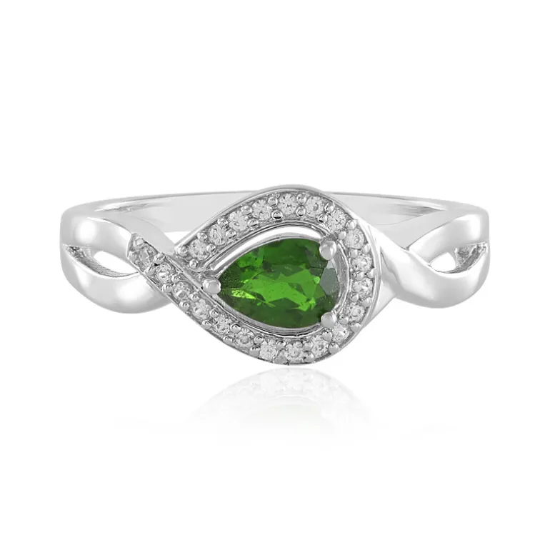 Dieser bezaubernde Ring aus russischem Diopsid zeigt einen leuchtenden, tropfenförmigen Edelstein von 0,599 Karat, der in platiniertem 925er Sterlingsilber gefasst ist. Die üppigen Grüntöne des zentralen Steins werden von 21 funkelnden Zirkonen im Rundschliff aus Kambodscha akzentuiert, die ein Gesamtkaratgewicht von 0,88 ct ergeben. Dieser Ring ist ein Zeugnis der Raffinesse, perfekt, um Ihrer Abendgarderobe einen Farbtupfer zu verleihen oder bei besonderen Anlässen ein Statement zu setzen.