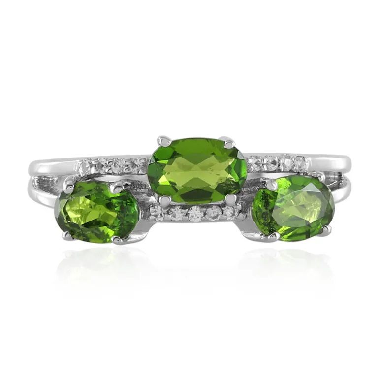Dieser Ring präsentiert ein Trio aus üppigen grünen russischen Diopsid-Edelsteinen von insgesamt 1,112 Karat, die elegant zwischen funkelnden kambodschanischen Zirkonen eingebettet sind. Der Ring ist in platiniertem Sterlingsilber gefasst, das für zusätzliche Haltbarkeit und Glanz sorgt, und verkörpert die Essenz der Raffinesse. Perfekt, um Ihrem Alltagsoutfit einen farbigen Akzent zu verleihen oder als Accessoire für besondere Anlässe zu dienen.
