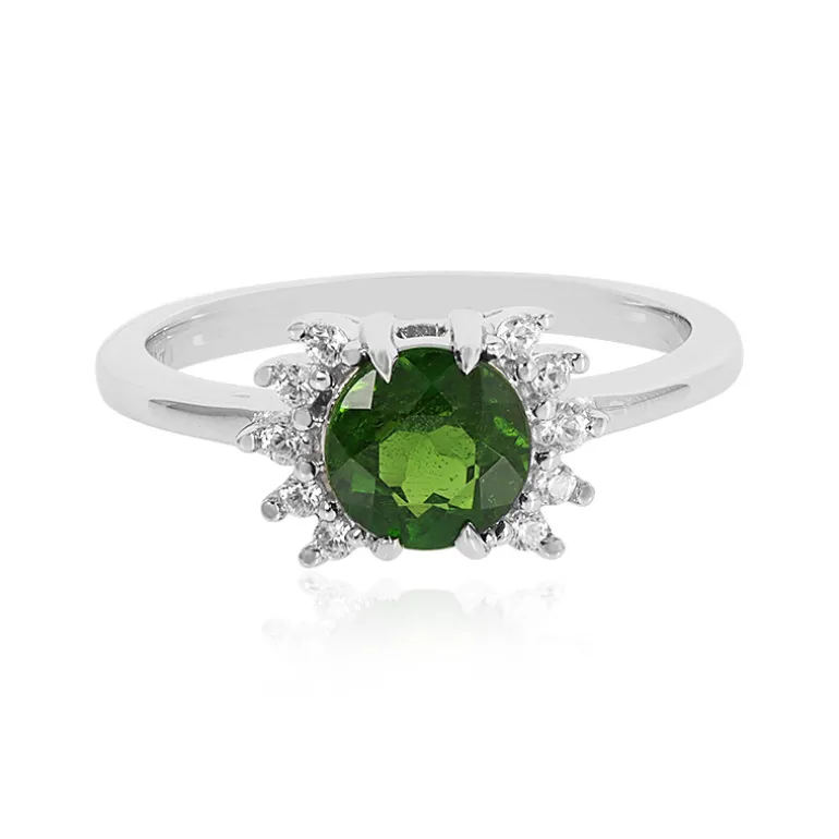 Präsentieren Sie die Pracht der Natur mit diesem atemberaubenden Ring aus russischem Diopsid, der elegant in platiniertes 925er Sterlingsilber gefasst ist. Der zentrale Edelstein hat einen fesselnden Rundschliff mit einem Gewicht von 0,906 Karat und einen satten, grünen Farbton, der an üppige Wälder erinnert. Eingerahmt von funkelnden kambodschanischen Zirkon-Akzenten von insgesamt 0,135 Karat, strahlt das Design Raffinesse aus. Dieses Schmuckstück ist eine vielseitige Ergänzung Ihrer Sammlung und passt sowohl zu legeren als auch zu formellen Anlässen. Seine unverwechselbare Farbe und sein Schimmer sind ideal, um neutrale Outfits zu beleben oder mit Erdtönen zu kombinieren.