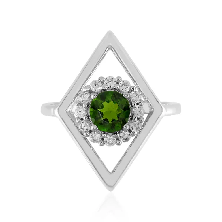 Entdecken Sie die Anziehungskraft dieses platinierten Rings aus 925er Sterlingsilber mit einem lebhaften russischen Diopsid von 0,744 Karat, der von funkelnden kambodschanischen Zirkonen von insgesamt 0,388 Karat umgeben ist. Der runde Schliff in der Mitte zieht die Blicke auf sich, während die geometrische Silhouette einen modernen Charme versprüht. Perfekt, um Ihrem Alltagsoutfit einen Hauch von Raffinesse zu verleihen oder als auffälliges Schmuckstück für besondere Anlässe.