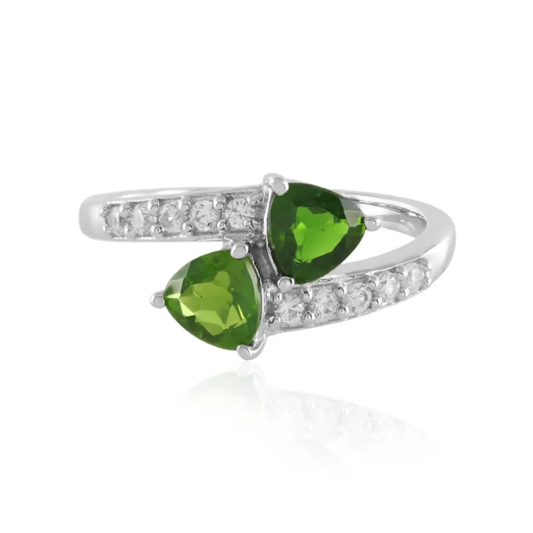 Entdecken Sie die Faszination russischer Edelsteine mit diesem bezaubernden Trilogie-Ring mit russischen Diopsiden im Trillant-Schliff (0,969 Karat), umhüllt vom Glanz des platinierten 925er Sterlingsilbers. Zehn kambodschanische Zirkone im Rundschliff mit einem Gesamtgewicht von 0,222 ct sind kunstvoll eingefasst, um die natürliche Pracht der grünen Steine zu unterstreichen. Das kontrastreiche Funkeln erzeugt ein faszinierendes Lichtspiel und macht diesen Ring zu einer idealen Wahl sowohl für den lässigen Glamour als auch für formelle Anlässe. Kombinieren Sie diesen Ring mit klassischer oder moderner Kleidung und verleihen Sie ihr einen Hauch von grünem Glanz.
