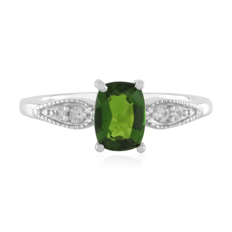 Entdecken Sie die Eleganz dieses atemberaubenden Rings mit russischem Diopsid, der aus platiniertem 925er Sterlingsilber gefertigt ist. Mit einem antik geschliffenen Diopsid von 0,757 Karat und einem kambodschanischen Zirkon bietet dieser Ring ein Gesamtkaratgewicht von 0,814 Karat. Er eignet sich sowohl für den täglichen Gebrauch als auch für besondere Anlässe und passt sowohl zu formeller als auch zu legerer Kleidung, wobei er jedem Outfit einen Hauch von Raffinesse verleiht.