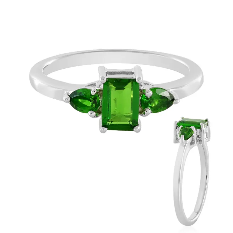 Dieses exquisite Stück zeigt einen atemberaubenden russischen Diopsid im Oktagon-Schliff, flankiert von zwei birnenförmigen Steinen mit insgesamt 0,879 Karat. Die leuchtend grünen Edelsteine sind fachmännisch in platiniertes 925er Sterling Silber gefasst und verleihen ihm einen Hauch von Eleganz. Die Herkunft des Edelsteins und sein präziser Schliff verstärken die Anziehungskraft des Rings und machen ihn zu einem perfekten Begleiter für legere und formelle Anlässe. Seine Eleganz wertet jedes Outfit auf und macht ihn zu einem idealen Geschenk für einen besonderen Menschen oder zu einer wertvollen Ergänzung Ihrer Sammlung.