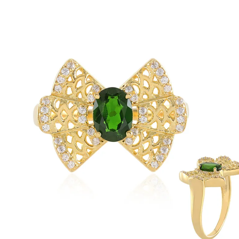 Entdecken Sie die Faszination dieses Rings aus russischem Diopsid, dessen Herzstück ein auffälliger Edelstein mit 0,682 Karat im Ovalschliff ist. Umgeben von 36 kambodschanischen Zirkonen im Rundschliff mit einem Gesamtgewicht von 0,243 Karat, die jeweils von Hand in ein glänzendes Band aus 925er Sterlingsilber mit einer exquisiten Goldplattierung eingefasst sind, wiegt er etwa 3,37 Gramm. Das filigrane Design versprüht einen raffinierten Charme und macht es zu einer idealen Wahl sowohl für legere Eleganz als auch für formelle Anlässe. Als lebendige Ergänzung zu jeder Schmucksammlung verspricht dieser Ring einen Hauch von luxuriösem grünen Glanz an Ihrer Hand.