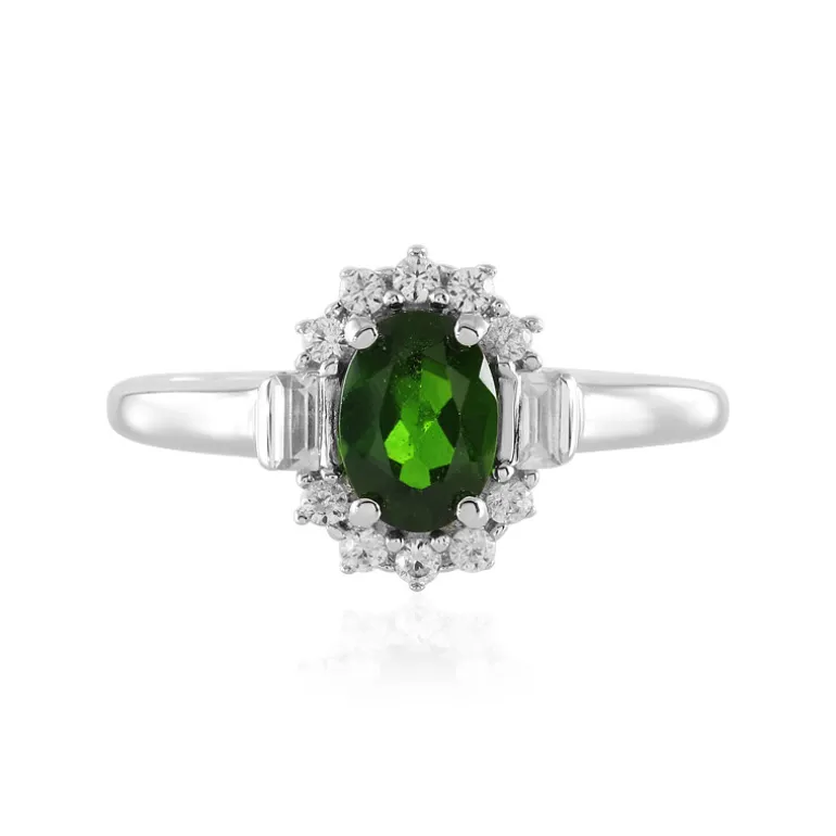 Entdecken Sie die Eleganz dieses atemberaubenden Rings mit einem lebhaften russischen Diopsid, der in einer wunderschönen ovalen Form geschliffen und mit funkelnden Baguetten und runden Zirkonen aus Kambodscha akzentuiert ist. Der Ring ist aus platiniertem Sterlingsilber gefertigt und strahlt Raffinesse aus. Perfekt für Abendveranstaltungen oder um der Alltagskleidung einen Hauch von Klasse zu verleihen. Eine vielseitige Ergänzung für jede Schmucksammlung.
