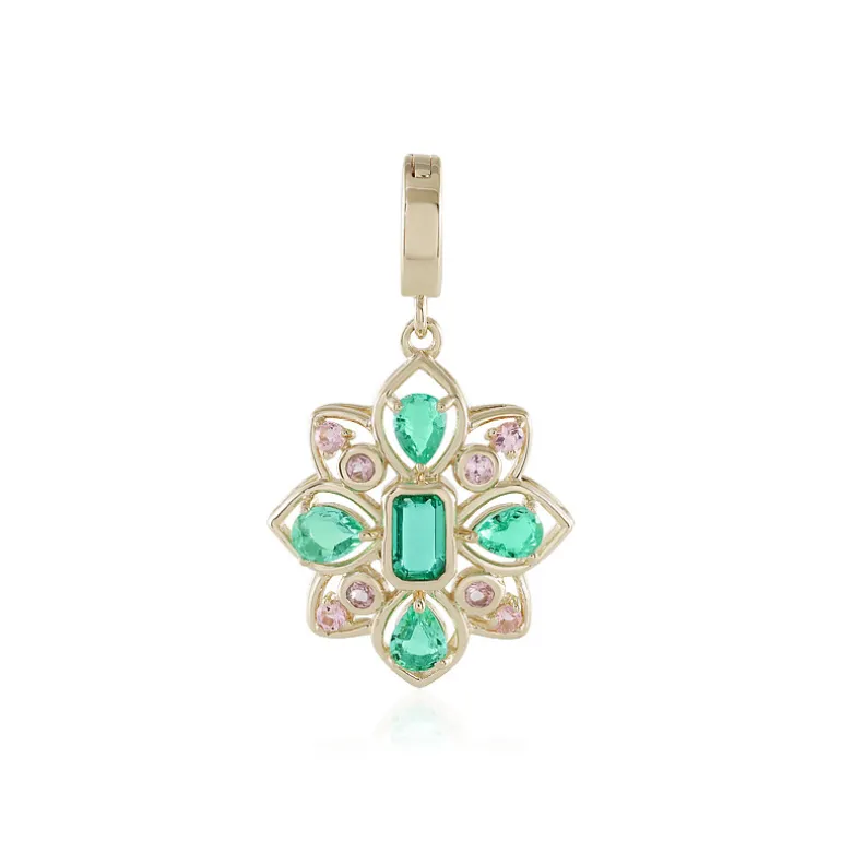 Dieser bezaubernde Anhänger aus 375er Gold mit einem Gesamtgewicht von 0,931 Karat zeigt die Faszination russischer Smaragde in einem floral inspirierten Design. Der zentrale Smaragd im Achteckschliff wird von vier anmutig geformten tropfenförmigen Smaragden umrahmt, die von einem Heiligenschein aus funkelnden rosa Turmalinen aus Nigeria akzentuiert werden. Der Anhänger wird mit einem vielseitigen Varioclip geliefert und ist ein perfektes Accessoire, um sowohl der Tages- als auch der Abendgarderobe einen Hauch von Raffinesse zu verleihen.