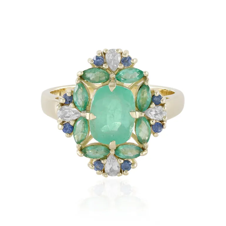 Dieser auffällige Ring mit russischem Smaragd glänzt mit einem Mittelstück von 1,13 Karat, umgeben von bezaubernden Smaragden im Marquiseschliff von insgesamt 0,58 Karat. Kambodschanische Zirkontropfen und blaue Saphire aus Madagaskar ergänzen diese lebhaften Edelsteine zu einem raffinierten floralen Motiv. Dieser Ring aus 9 Karat Gelbgold mit einem Gewicht von 3,6 g ist ein künstlerisches Wunderwerk und zugleich ein Beweis für die hohe Kunstfertigkeit. Die Eleganz des Rings ist ideal für besondere Anlässe und passt hervorragend zur Abendgarderobe. Mit seinen leuchtenden Farben und exquisiten Details wertet er jedes Ensemble auf.