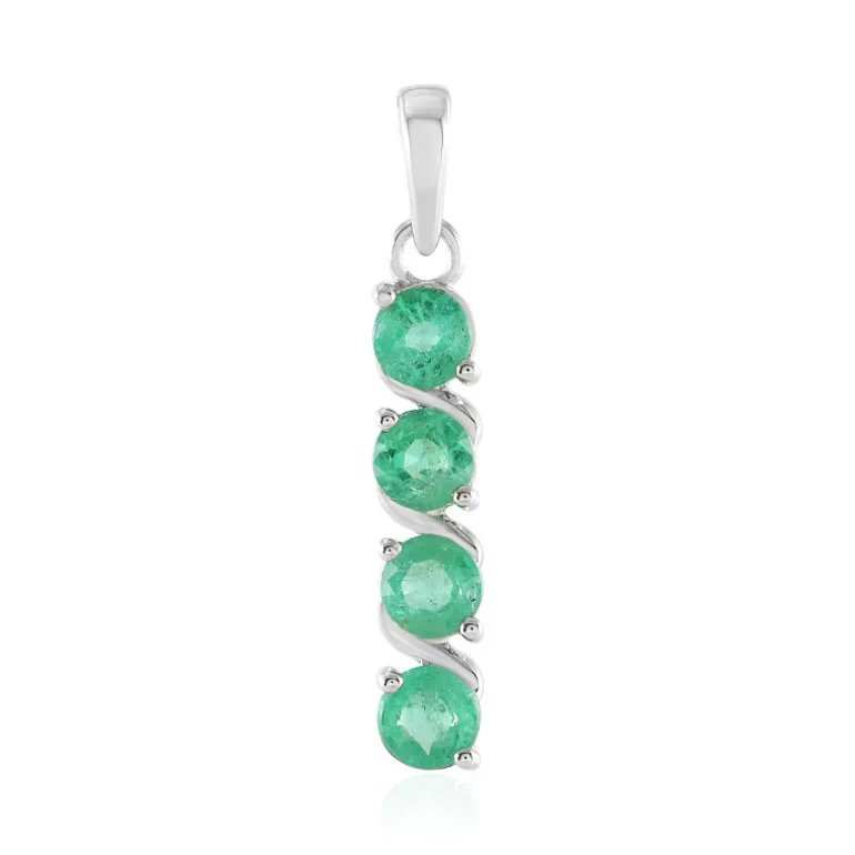 Ein vertikaler Strahl aus leuchtenden Grüntönen beleuchtet diesen Anhänger aus Sterlingsilber und hebt die vier russischen Smaragde im Rundschliff mit insgesamt 0,942 Karat hervor. Der Anhänger präsentiert die Edelsteine anmutig in einer platinierten 925er-Sterlingsilberfassung und wiegt etwa 0,98 Gramm. Mit einer Größe von 26 x 4 mm ist dieses Schmuckstück eine zeitlose Ergänzung für jede Sammlung und ideal, um Alltagsoutfits aufzuwerten oder Abendgarderobe zu akzentuieren. Sein schlichtes, aber elegantes Design sorgt für Vielseitigkeit und unbestrittene Attraktivität.