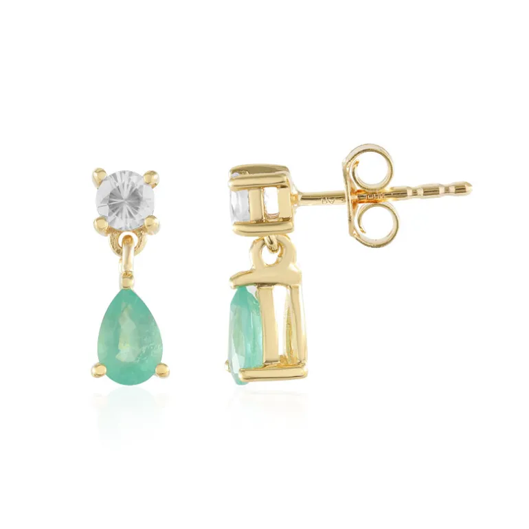 Diese exquisiten Ohrringe bestehen aus birnenförmigen russischen Smaragden und brillanten kambodschanischen Zirkonen, die in vergoldetes 925er Sterlingsilber gefasst sind. Mit einem Gesamtkaratgewicht von 1,062 ct verleihen die leuchtenden Grüntöne einen Hauch von Luxus. Diese Ohrringe sind sowohl für den Tag als auch für den Abend geeignet und passen hervorragend zu eleganten Kleidern oder einer schicken Bluse, die jedem Ensemble einen Hauch von Raffinesse verleihen.