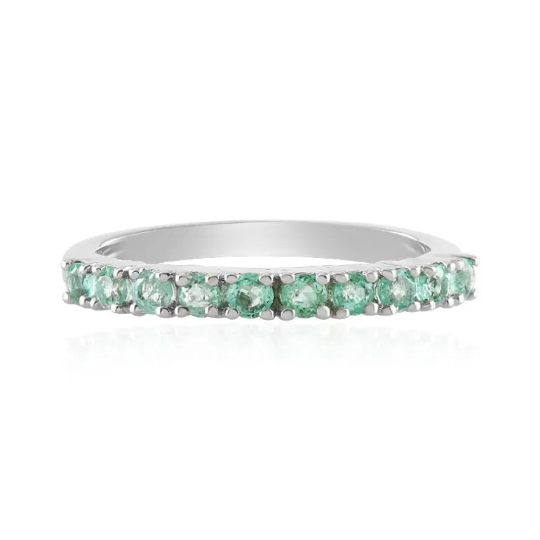 Dieser verführerische Ring besteht aus einer fortlaufenden Schleife aus 10 russischen Smaragden im Rundschliff mit einem Gesamtgewicht von 0,433 ct, die in hochwertigem platiniertem 925er Sterlingsilber gefasst sind und einen dauerhaften Glanz verleihen. Die zarten Grüntöne erinnern an den Frühling und passen sowohl zu legeren als auch zu formellen Anlässen. Dieses Schmuckstück ist ideal, um Ihrem Alltagsoutfit einen Hauch von Eleganz zu verleihen oder Ihre Abendgarderobe abzurunden, denn es verkörpert mühelos Raffinesse.