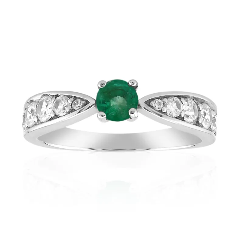 Dieser strahlende Ring zeigt einen glänzenden russischen Smaragd im Rundschliff von 0,266 Karat, gefasst in platiniertem 925er Sterlingsilber, ergänzt durch eine funkelnde Reihe von kambodschanischen Zirkonen im Rundschliff von insgesamt 0,608 Karat. Der Kontrast zwischen dem sattgrünen Smaragd und den funkelnden Zirkonen schafft eine Symphonie der Eleganz. Dieser Ring eignet sich perfekt, um jedem Ensemble einen Hauch von Raffinesse zu verleihen. Er ist vielseitig genug, um tagsüber getragen zu werden, und schick genug für Abendveranstaltungen.
