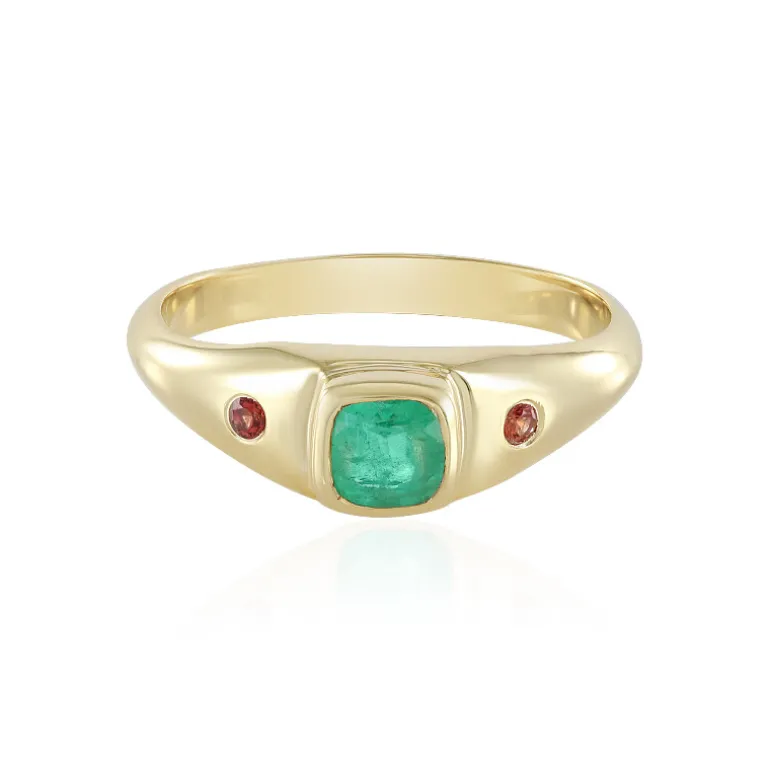 Entdecken Sie die Faszination dieses Rings aus vergoldetem 925er Sterlingsilber mit einem russischen Smaragd im Kissenschliff von 0,588 Karat, flankiert von Rubinen im Rundschliff von insgesamt 0,077 Karat aus Tansania. Mit seinem klassischen Design und der glänzenden Oberfläche hat dieser Ring ein Gesamtgewicht von 0,665ct. Er ist ideal, um jedem Anlass einen Hauch von Eleganz zu verleihen. Kombinieren Sie dieses Schmuckstück sowohl mit Berufskleidung als auch mit Abendgarderobe, um ein raffiniertes Statement abzugeben.