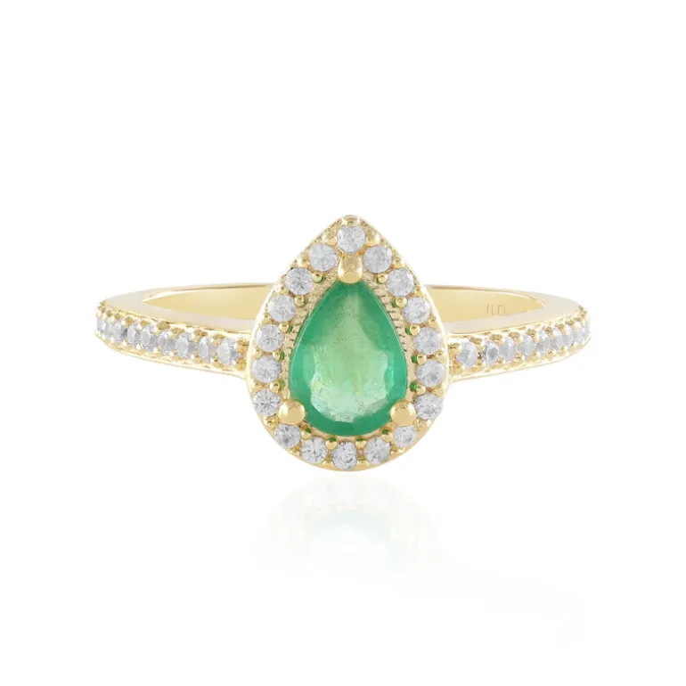 Entdecken Sie die Raffinesse dieses atemberaubenden Rings mit einem birnenförmigen russischen Smaragd von 0,522 Karat, der von 50 kambodschanischen Zirkonen wunderschön akzentuiert wird. Das elegante Design des Rings aus vergoldetem 925er Sterlingsilber ist sowohl für den Alltag als auch für besondere Anlässe geeignet. Kombinieren Sie ihn mit Abendgarderobe oder werten Sie einen Freizeitlook auf. Ein vielseitiges Stück für jede Schmucksammlung.