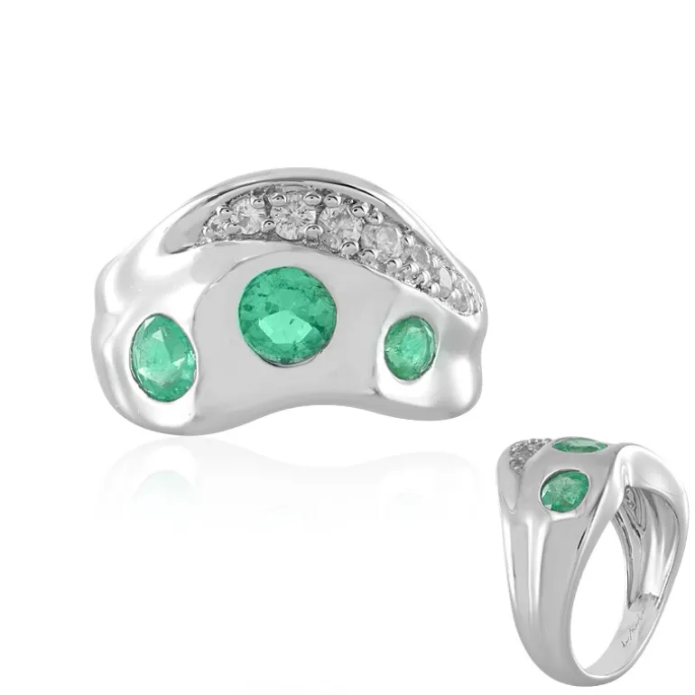 Dieser prächtige Silberring mit russischem Smaragd und Zirkon ist ein Meisterwerk der Eleganz. Ein Trio aus leuchtend grünen Smaragden mit einem Gesamtgewicht von 1,155 ct. wird von funkelnden Zirkonen akzentuiert, die die Helligkeit der Smaragde unterstreichen. Das Band aus 925er Sterlingsilber unterstreicht die Faszination des Rings. Der Ring eignet sich sowohl für zwanglose Brunches als auch für formelle Anlässe und ist vielseitig genug, um jedes Outfit zu ergänzen.