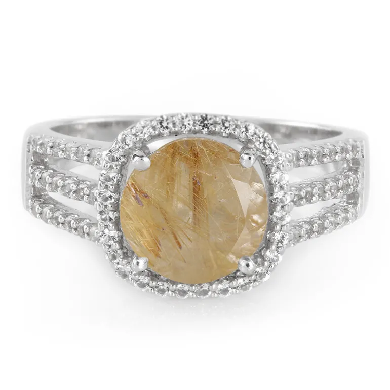 Entdecken Sie die Wärme und Faszination dieses Rings aus Sterlingsilber mit einem atemberaubenden brasilianischen Rutilquarz von 1,54 Karat, der für seine fesselnden goldenen nadelartigen Einschlüsse bekannt ist. Ergänzt durch eine Reihe funkelnder weißer Topase weist dieser Ring ein Gesamtgewicht von 1,887 Karat auf. Mit seinem schicken Design und dem Schimmer der 64 weißen Topase lässt sich dieses Schmuckstück mühelos von der Tagesgarderobe bis zur Abendgarderobe tragen. Dieser Ring ist ideal für alle, die die einzigartige Schönheit natürlicher Edelsteine zu schätzen wissen und verspricht, auf jeder Veranstaltung für Gesprächsstoff zu sorgen.