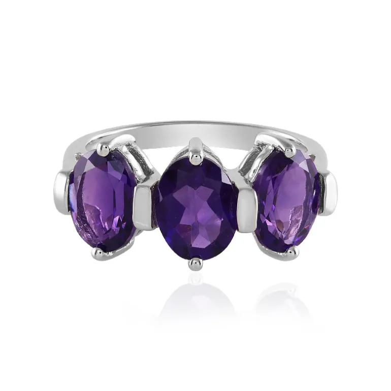 Entdecken Sie die Anziehungskraft von tiefem Violett mit unserem sambischen Amethyst-Sterlingsilberring, der ein atemberaubendes Trio von Amethysten im Ovalschliff mit insgesamt 3,203 Karat aufweist. Jeder Edelstein wurde sorgfältig nach seinem leuchtenden Farbton und seiner Brillanz ausgewählt, um die Essenz der Eleganz zu unterstreichen. Der Ring aus hochwertigem 925er Sterlingsilber mit einer luxuriösen Platinbeschichtung wiegt etwa 2,12 Gramm und bietet eine perfekte Harmonie aus Stil und Komfort. Er eignet sich ideal für Abendveranstaltungen oder als wertvolles Geschenk und ist eine zeitlose Ergänzung für jede Schmucksammlung.