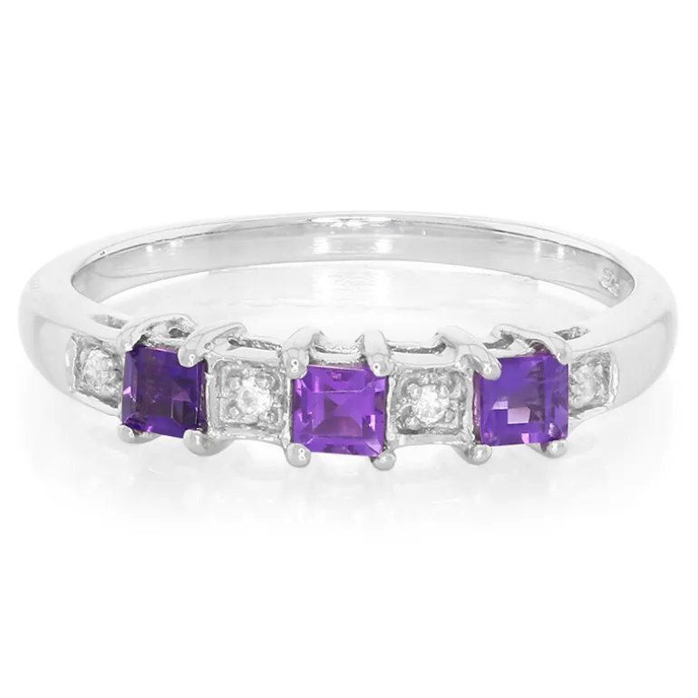 Entdecken Sie die Eleganz dieses exquisiten Rings mit drei lebhaften sambischen Amethysten im Carré-Schliff, die von vier funkelnden kambodschanischen Zirkonen ergänzt werden. Das Band aus 925er Sterlingsilber hebt die glänzenden Edelsteine hervor und macht ihn perfekt für den Alltag und besondere Anlässe. Kombinieren Sie ihn mit Abendgarderobe oder eleganten Tagesoutfits für einen raffinierten Touch.