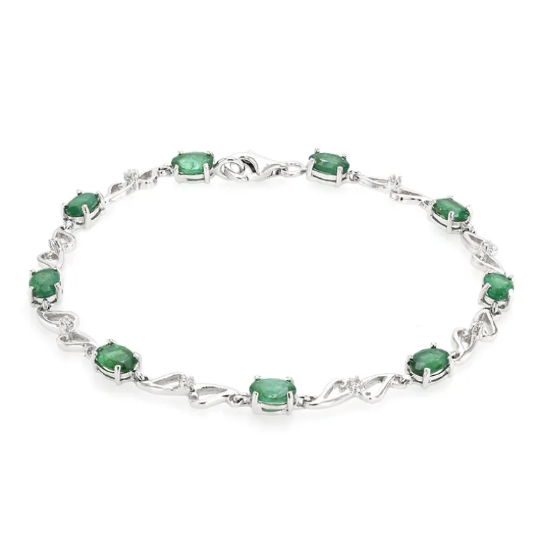 Tauchen Sie ein in die Anziehungskraft der sambischen Eleganz mit diesem Armband aus Sterlingsilber mit neun Smaragden im Ovalschliff von insgesamt 3,64 Karat. Die leuchtenden Grüntöne werden von acht funkelnden weißen Saphiren aus Madagaskar ergänzt. Mit einem Gewicht von 4,65 Gramm und einer komfortablen Länge von 19 cm ist dieses exquisite Stück perfekt geeignet, um sowohl legere als auch formelle Kleidung mit einem Hauch von Raffinesse zu versehen. Machen Sie dieses Armband zu Ihrem bevorzugten Accessoire für ein gehobenes Ensemble.