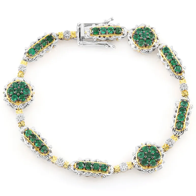 Schmücken Sie Ihr Handgelenk mit einer luxuriösen Mischung aus 45 strahlenden, rund geschliffenen sambischen Smaragden von insgesamt 2,552 ct, akzentuiert durch 7 funkelnde kambodschanische Zirkone von zusätzlich 0,34 ct. Das aus hochwertigem 925er Sterling Silber gefertigte Schmuckstück von Gems en Vogue wiegt ca. 11,36 g und hat eine Länge von 17,5 cm. Das Zusammenspiel von leuchtend grünen Smaragden und schimmernden Zirkonsteinen schafft ein Ensemble, das sich sowohl für elegante Abende als auch als farblicher Akzent im Alltag eignet.