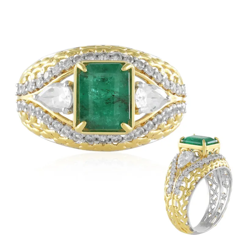 Entdecken Sie die Eleganz dieses atemberaubenden sambischen Smaragdrings mit einem Stein im Smaragdschliff von 1,8 Karat. Das Band aus 925er Sterlingsilber ist mit zwei Zirkonen im Birnenschliff und 38 kambodschanischen Zirkonen im Rundschliff von insgesamt 3,632 ct geschmückt. Dieser Ring eignet sich perfekt für Abendveranstaltungen oder als glamouröser Begleiter für den Alltag und passt hervorragend zu eleganten Kleidern.