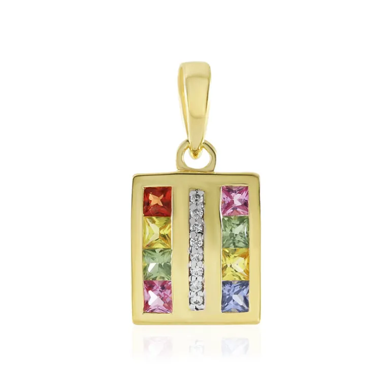 Entdecken Sie die lebendige Anziehungskraft dieses vergoldeten Anhängers aus Sterlingsilber, einer Schatztruhe mit mehrfarbigen Saphiren aus Madagaskar und Thailand. Mit einem Gesamtgewicht von 0,854 ct bestechen diese präzise geschliffenen, quadratischen Prinzess-Saphire in Rosa-, Gelb-, Grün-, Blau- und Orangetönen, die durch funkelnde Zirkone aus Kambodscha ergänzt werden. Mit seinen Maßen von 20 x 10 mm ist er ein vielseitiges Schmuckstück, das sowohl im Alltag als auch bei besonderen Anlässen für einen Hauch von Farbe sorgt. Das moderne Design und die glänzende Vergoldung sorgen dafür, dass dieser Anhänger in jeder Schmucksammlung einen Ehrenplatz einnimmt.