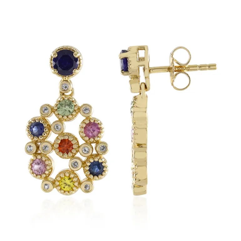 Entdecken Sie die Symphonie der Farben mit unseren leuchtenden Ohrringen aus 925er Sterlingsilber, die in eine luxuriöse Goldplattierung getaucht sind. Jedes Stück präsentiert eine faszinierende Reihe von rundgeschliffenen Saphiren aus den exotischen Ländern Madagaskars mit insgesamt 1,58 Karat. Die komplizierte Anordnung von blauen, grünen, gelben, orangen und rosafarbenen Saphiren bietet einen Blick in ein tropisches Paradies. Diese Ohrringe sind so vielseitig wie exquisit und ideal, um ein elegantes Abendoutfit zu unterstreichen oder einen Farbtupfer in Ihre Tagesgarderobe zu bringen. Lassen Sie sich von der Anziehungskraft dieser Edelsteine für Ihren nächsten besonderen Anlass oder als wertvolles Geschenk verzaubern.
