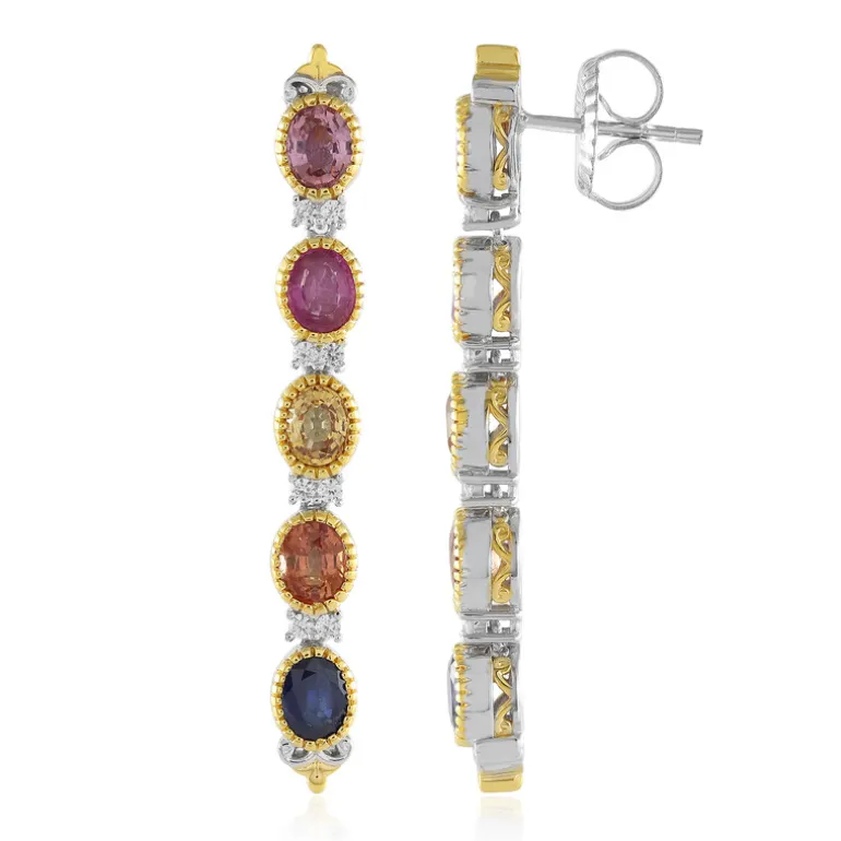 Entdecken Sie lebendige Eleganz mit diesen mehrfarbigen Saphir-Ohrringen aus 925er Sterlingsilber. Sie sind mit Saphiren aus Madagaskar und Thailand in Rosa-, Orange-, Gelb- und Blautönen besetzt, die von kambodschanischen Zirkonen hervorgehoben werden. Diese Ohrringe sind perfekt, um jedes Outfit zu verschönern, und verleihen sowohl legeren als auch formellen Anlässen einen Hauch von Farbe. Ein vielseitiges Stück, das sowohl schicke als auch anspruchsvolle Stile ergänzt.