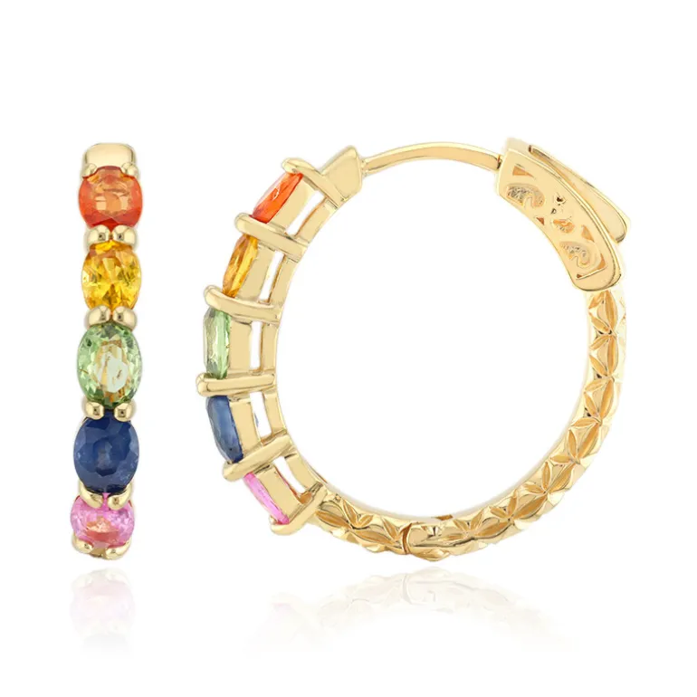 Diese eleganten Ohrringe mit Regenbogensaphiren aus Madagaskar und Tansania bestechen durch ihre leuchtende Vielfalt an grünen, blauen, rosafarbenen, orangen und gelben Saphiren. Die 21 mm großen Ohrringe aus vergoldetem Sterlingsilber haben ein Gesamtkaratgewicht von 1,908 ct. Sie eignen sich perfekt, um jedem Ensemble einen Farbtupfer zu verleihen, und sind eine exquisite Wahl sowohl für legere als auch für formelle Anlässe.