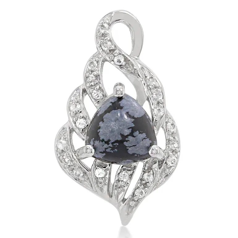 Entdecken Sie den bezaubernden Tanz von Funkeln und Muster mit diesem verführerischen Schneeflocken-Obsidian-Anhänger. Mit einem zentralen 2,27ct Trillant-Cabochon-Stein, flankiert von 0,233ct schimmerndem White Topaz aus Brasilien, ist er ein Zeugnis der Schönheit der Natur. Jedes Stück ist sorgfältig aus 925er Sterlingsilber gefertigt und wiegt etwa 3,18 g. Das himmlische Schneeflockenmuster macht diesen Anhänger zu einem einzigartigen Schmuckstück, das sowohl zu legeren als auch zu formellen Anlässen einen Hauch von Faszination ausstrahlt. Lassen Sie ihn das Herzstück Ihres Outfits für ein besonderes Abendessen sein oder werten Sie Ihre Bürokleidung mit seiner schlichten Eleganz auf.