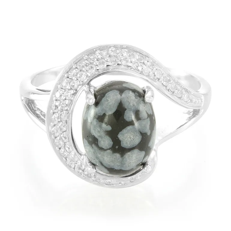 Entdecken Sie die Faszination des Winters in diesem raffinierten Obsidianring mit Schneeflocken. Ein ovaler Cabochon von 2,97 Karat aus den USA wird anmutig von einem 925er Sterlingsilberband umrahmt, das von 43 funkelnden Zirkonen aus Kambodscha mit insgesamt beeindruckenden 0,312 Karat akzentuiert wird. Dieser Ring mit einem Gewicht von ca. 2,79 Gramm vereint den eleganten Charme des schneebedeckten Obsidians mit der Brillanz der Zirkone und eignet sich daher sowohl für legere als auch für formelle Anlässe. Ob bei einer eleganten Gala oder im Alltag – dieses exquisite Schmuckstück ist ein echter Hingucker und sorgt für Gesprächsstoff.