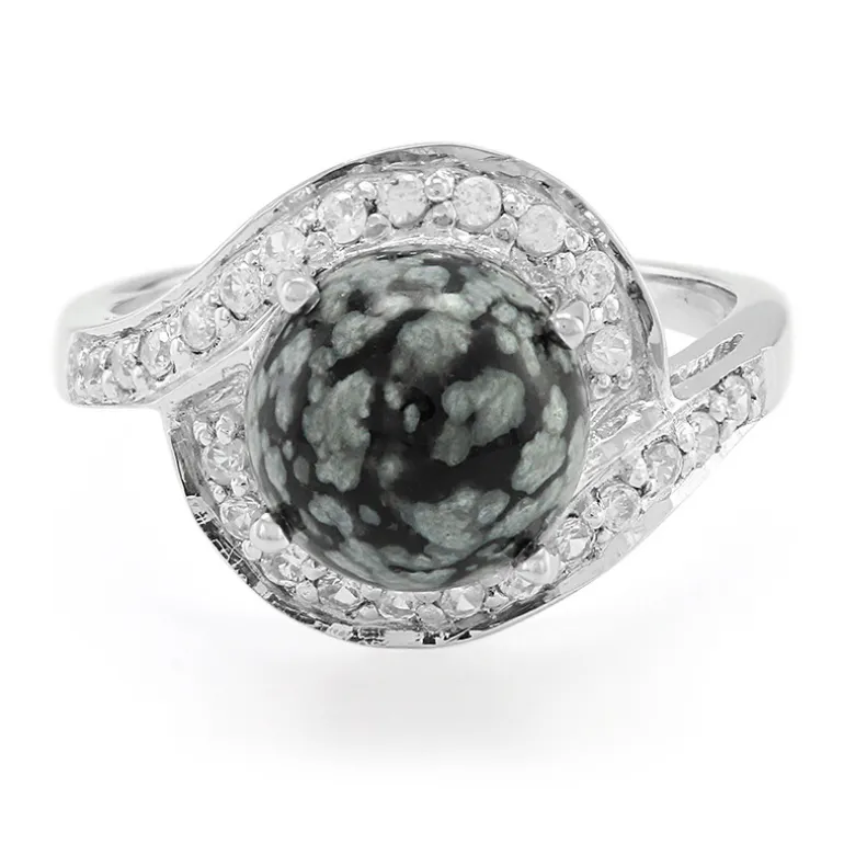Schmücken Sie Ihre Hand mit der faszinierenden Schönheit dieses Schneeflocken-Obsidianrings, der einen einzigartigen runden Cabochon-Stein von 3,62 Karat aus den USA präsentiert. Umgeben von 24 funkelnden Zirkonen aus Kambodscha mit einem Gesamtgewicht von 0,558 ct, gefasst in hochwertigem 925er Sterlingsilber mit einem Gewicht von ca. 3,11 g. Mit seinen kontrastierenden schwarzen und weißen Mustern erinnert dieses Schmuckstück an ein Wintermärchen. Er ist ideal, um sowohl bei Tag als auch bei Nacht einen Hauch von Dramatik zu erzeugen und wird bei jeder Veranstaltung für Gesprächsstoff sorgen.