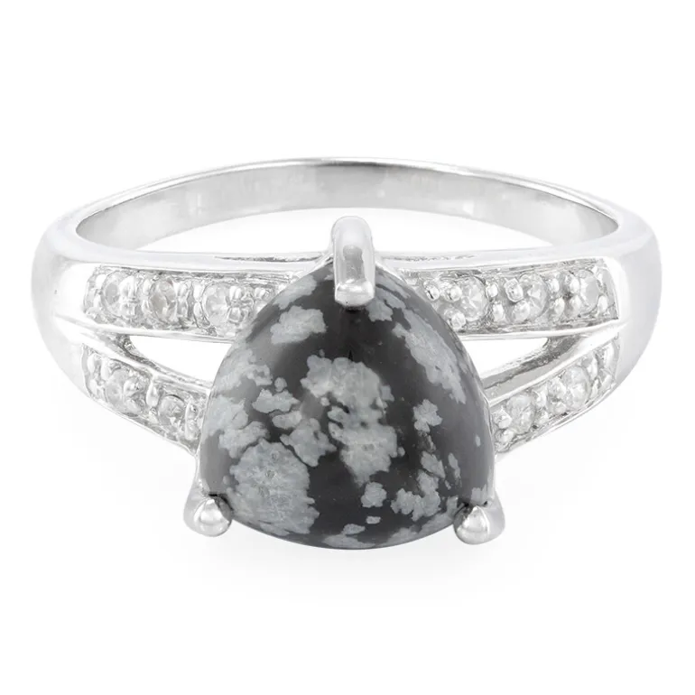 Entdecken Sie die Anziehungskraft winterlicher Eleganz mit diesem Ring aus Schneeflocken-Obsidian, der einen einzigartigen 2,95-karätigen Trillant-Cabochon-Edelstein aus den USA präsentiert. Umrahmt von funkelnden Zirkon-Akzenten von insgesamt 0,235 ct aus Kambodscha, ist dieses Schmuckstück in hochwertigem 925er Sterlingsilber mit einem Gewicht von ca. 3,25 g gefasst. Das unverwechselbare Muster des Obsidians ähnelt zarten Schneeflocken und sorgt für Gesprächsstoff bei jeder Veranstaltung. Dieser Ring ist ideal, um Ihrer Abendgarderobe einen Hauch von Raffinesse zu verleihen oder ein legeres Outfit aufzuwerten. Er ist ein vielseitiger Schatz für Ihre Sammlung.