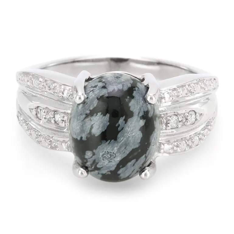 Entdecken Sie die faszinierende Schönheit dieses schicken Obsidianrings mit Schneeflockenmuster, ein Statement-Stück mit einzigartigem Charme. Der aus den USA stammende zentrale Edelstein wiegt 3,81 Karat und ist in einen verführerischen ovalen Cabochon geschliffen, der das charakteristische Schneeflockenmuster zur Geltung bringt. Vier runde Zirkone im Brillantschliff aus Kambodscha mit insgesamt 0,094 Karat verleihen dem Design ein Funkeln, das sich hervorragend von dem dunklen Obsidian abhebt. Das massive Band des Rings aus 925er Sterlingsilber verleiht jedem Ensemble einen Hauch von Eleganz. Er eignet sich sowohl für zwanglose Ausflüge als auch für Abendveranstaltungen und ergänzt mit seinem faszinierenden Licht- und Schattenspiel eine Vielzahl von Stilen.