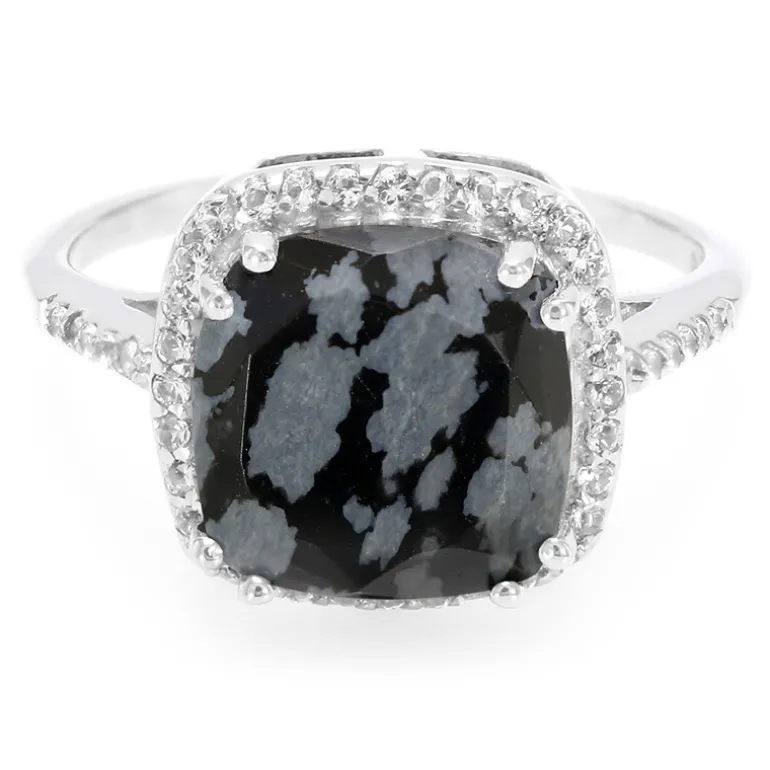 Tauchen Sie ein in die zeitlose Schönheit unseres Chic Snowflake Obsidian & Topaz Sterling Silber Rings. Dieses fein gearbeitete Stück präsentiert einen atemberaubenden 2,71 Karat antiken Obsidian im Kissenschliff aus den USA, der für sein einzigartiges, an Schneeflocken erinnerndes Muster bekannt ist. Der zentrale Obsidian wird von 42 brasilianischen weißen Topasen mit einem Gesamtgewicht von 0,234 Karat eingerahmt, die vor Brillanz glänzen. Mit einem Gesamtkaratgewicht von 2,944 ct, gefasst in etwa 2,74 Gramm 925er Sterlingsilber, ist dieser Ring ein Statement der Eleganz. Er lässt sich sowohl zu Freizeitkleidung als auch zu formellen Anlässen tragen und ist somit eine vielseitige Ergänzung für jede Schmucksammlung.