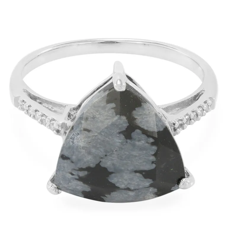 Entdecken Sie die Mystik dieses schicken Schneeflocken-Obsidianrings mit einem auffälligen 3,99-karätigen Edelstein aus den USA, der präzise in Trilliant-Form geschliffen wurde, um seine einzigartigen schneeflockenartigen Muster zu maximieren. Das Band aus 925er Sterlingsilber mit einem Gewicht von 1,48 g umschließt elegant den zentralen Stein und wird von glitzernden weißen Topasen aus Brasilien akzentuiert, die ihm ein dezentes Funkeln verleihen. Dieser Ring eignet sich sowohl für die Freizeit als auch für besondere Anlässe. Er zieht alle Blicke auf sich und ergänzt Ihre Lieblingsoutfits.