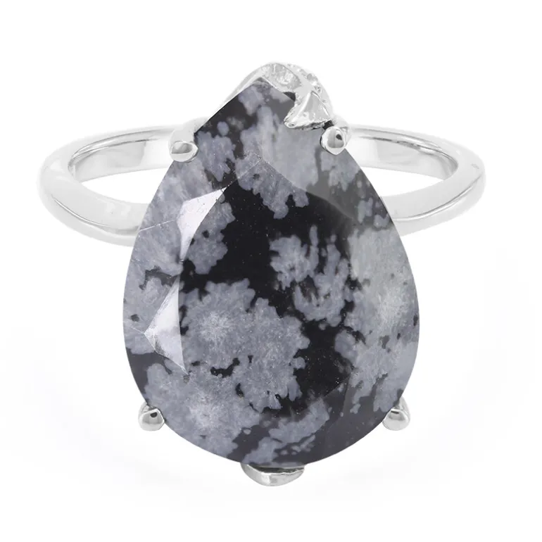 Entdecken Sie die atemberaubende Schönheit dieses Rings aus Snowflake Obsidian, gefasst in glänzendem 925er Sterlingsilber und akzentuiert mit funkelndem weißen Topas aus Brasilien. Der zentrale Edelstein hat einen dramatischen 6,04-Karat-Tropfenschliff, dessen einzigartiges Muster an winterliche Schneeflocken erinnert und ein kühnes Statement an Ihrem Finger abgibt. Dieses Schmuckstück ist nicht einfach nur ein Schmuckstück, es ist ein Gesprächsanlass. Der Ring ist ideal, um einem eleganten Abendlook einen Hauch von Faszination zu verleihen oder die Tagesgarderobe aufzuwerten, und verspricht Vielseitigkeit für eine Vielzahl von Stilen und Anlässen.