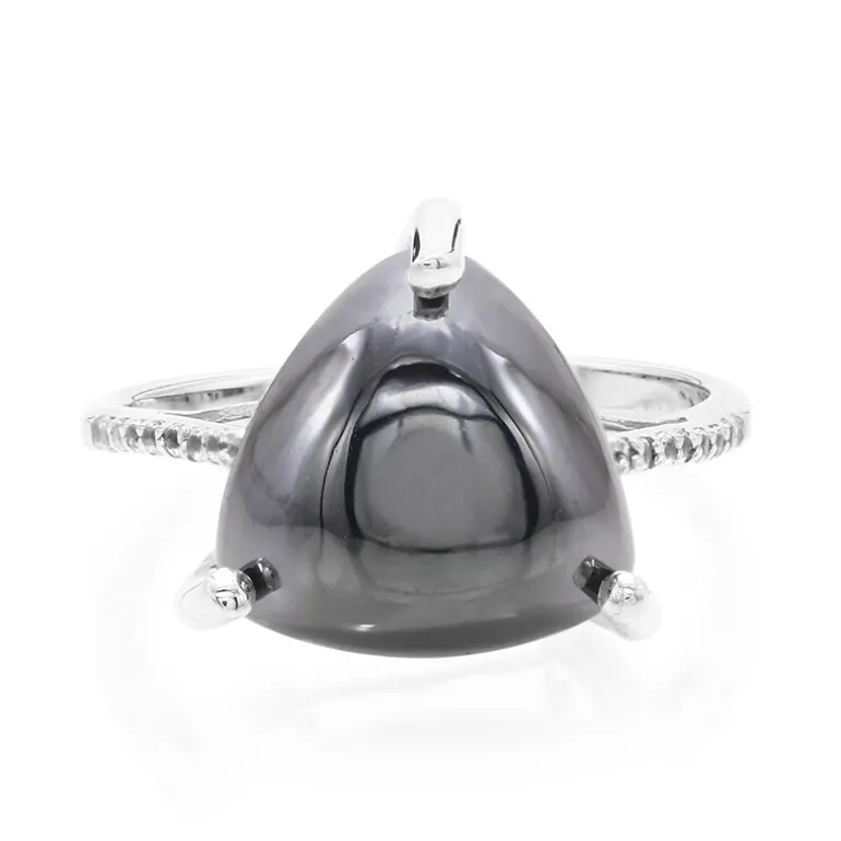 Entdecken Sie die kühne Anziehungskraft dieses Rings aus Sterlingsilber mit einem auffälligen 11,37-karätigen Cabochon aus schwarzem Hämatit aus den USA, der majestätisch gefasst ist und die Blicke auf sich zieht. Um das Herzstück herum funkeln 14 strahlende weiße Topase aus Brasilien. Dieses zeitgenössische Schmuckstück mit einem Gewicht von ca. 1,92 g verbindet Raffinesse mit modernem Design und ist ein ideales Accessoire für legere und formelle Anlässe. Erhöhen Sie Ihren Stil mit diesem exquisiten Schmuckstück.