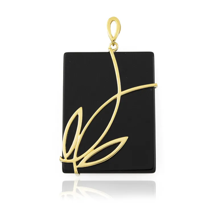 Entdecken Sie die Faszination dieses atemberaubenden Anhängers aus brasilianischem schwarzem Onyx mit einem 39,5 Karat großen Edelstein im Baguetteschliff. Der Anhänger ist in vergoldetem 925er Sterlingsilber gefasst und zeigt ein raffiniertes Blattmuster, das einen eleganten Kontrast zu dem tiefschwarzen Onyx bildet. Dieses 50×30 mm große Schmuckstück ist ein Beweis für modernes Design und zeitlose Eleganz. Er ist ideal für formelle Anlässe oder für den Alltag und passt zu vielen Stilen, vom schicken Business-Outfit bis zum kleinen Schwarzen.