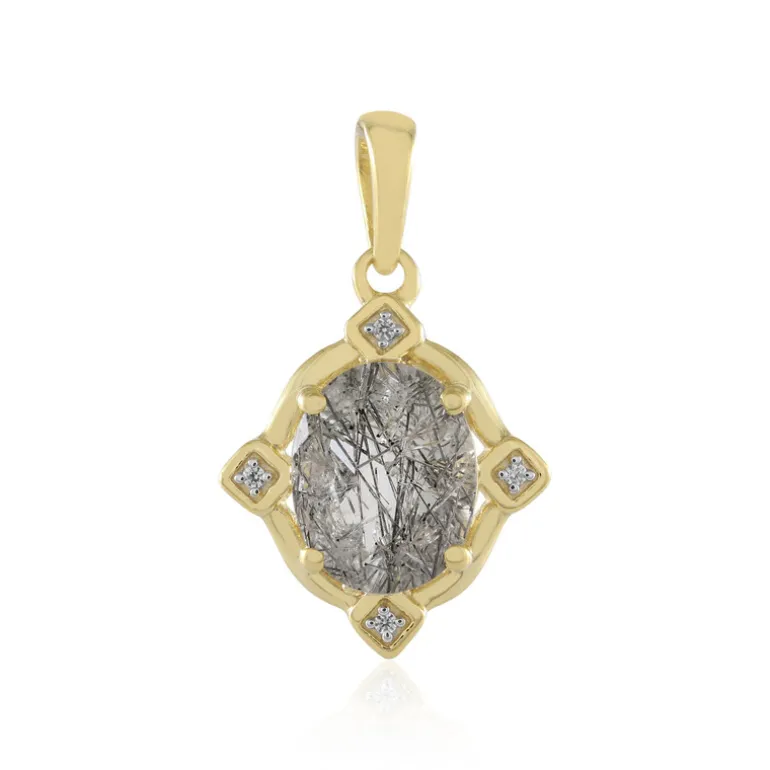 Entdecken Sie die Eleganz dieses exquisiten Anhängers mit einem faszinierenden schwarzen Rutilquarz aus Sri Lanka. Der ovale Edelstein wird von vier funkelnden Zirkonen aus Kambodscha ergänzt, die in vergoldetes 925er Sterlingsilber gefasst sind. Dieser Anhänger ist ideal, um jedem Ensemble einen Hauch von Raffinesse zu verleihen, und eignet sich sowohl für formelle Anlässe als auch für das schicke Tragen im Alltag.