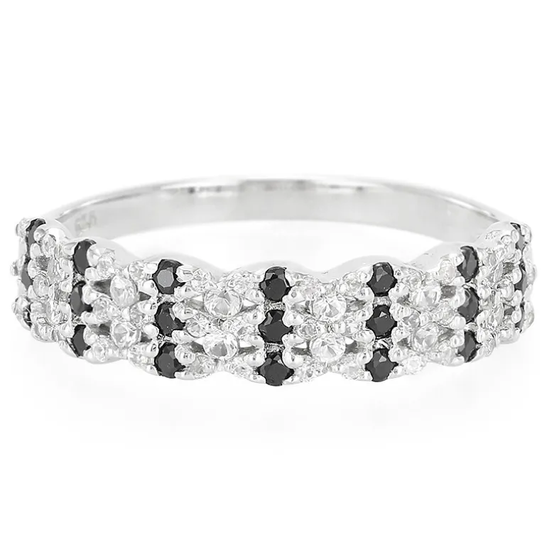 Entdecken Sie die perfekte Mischung aus monochromer Eleganz mit diesem Ring aus Sterlingsilber, der eine atemberaubende Reihe von 21 schwarzen Spinellen enthält, die von 54 weißen Saphiren aus Madagaskar flankiert werden. Die Kombination aus runden Edelsteinen im Brillantschliff mit einem Gesamtgewicht von 0,71 Karat ist in einem auffälligen Zickzack-Muster angeordnet, das moderne Raffinesse ausstrahlt. Der aus hochwertigem 925er Sterlingsilber gefertigte Ring setzt ein gewagtes Statement und ist gleichzeitig vielseitig genug, um jedes Outfit zu ergänzen, sei es für einen legeren Tagesausflug oder eine formelle Abendveranstaltung. Seine gewellte Kontur bietet nicht nur einen ausgeprägten optischen Reiz, sondern sorgt auch für einen bequemen Sitz im Alltag.