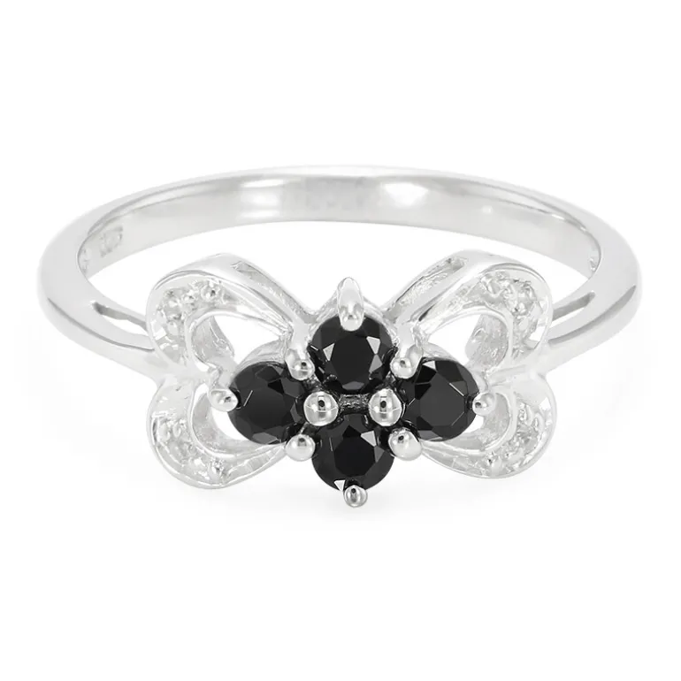 Entdecken Sie die Faszination des Kontrasts mit diesem atemberaubenden Ring aus Sterlingsilber mit 0,45 ct schwarzen Spinellen im Brillantschliff aus Thailand und 0,021 ct strahlenden weißen Topasen aus Brasilien. Das sorgfältig gearbeitete Schmetterlingsmotiv verleiht diesem exquisiten Stück einen skurrilen Charme und macht es zu einem perfekten Gesprächsanlass. Das Gewicht von 2,3 g sorgt für ein angenehmes Tragegefühl den ganzen Tag über. Ideal, um Ihrer Abendgarderobe einen Hauch von Raffinesse zu verleihen oder als einzigartiges Geschenk für eine besondere Person.