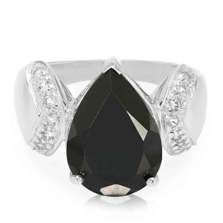 Entdecken Sie die Faszination dieses exquisiten Rings mit einem auffälligen schwarzen Spinell von 6,1 Karat aus Madagaskar im Tropfenschliff, der von 14 funkelnden weißen Topasen aus Brasilien ergänzt wird, gefasst in 925er Sterlingsilber. Dieser Ring ist perfekt geeignet, um Abendgarderobe oder eleganten Zusammenkünften einen Hauch von Raffinesse zu verleihen und ist ein echtes Statement. Kombinieren Sie ihn mit einem eleganten schwarzen Kleid oder einer raffinierten Abendgarderobe für ein atemberaubendes Ensemble.