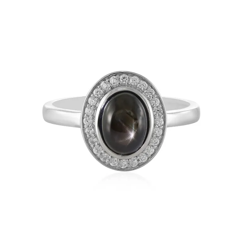 Dieser fesselnde Ring präsentiert einen verführerischen Thai Black Star Sapphire von 1,92 Karat, gefasst in hochglänzendem 925er Sterlingsilber mit Platinglanz. Die geheimnisvollen Tiefen des ovalen Cabochons werden durch den funkelnden Halo aus 24 kambodschanischen Zirkonen im Rundschliff hervorgehoben. Mit einem Gesamtgewicht von 2,19 Karat ist dieses Schmuckstück ein Statement der Eleganz. Kombinieren Sie es mit einem klassischen kleinen schwarzen Kleid oder verleihen Sie Ihrer Freizeitkleidung einen Hauch von Raffinesse. Er ist ideal für Abende oder besondere Anlässe und eine bezaubernde Ergänzung für jede Schmucksammlung.