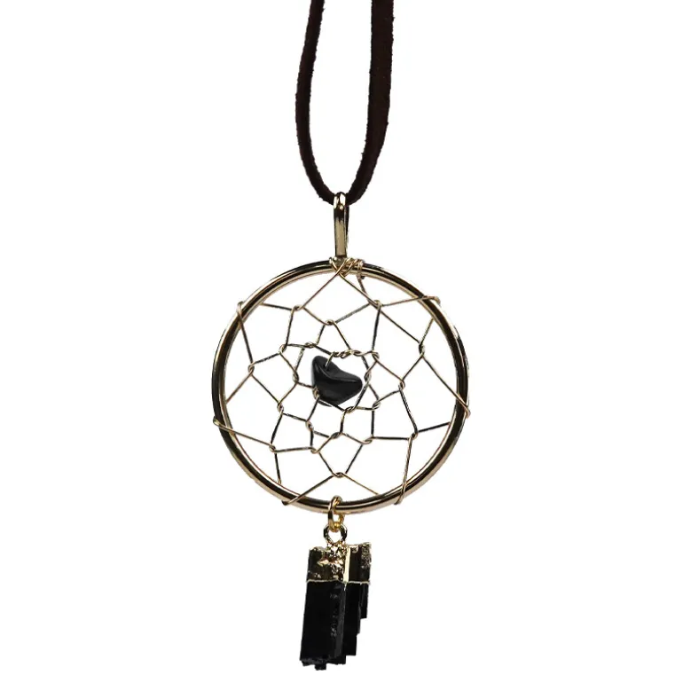 Dieser Traumfänger-Anhänger im böhmischen Stil ist von der Folklore der Eingeborenen inspiriert und besticht durch dunkle Schörl-Edelsteine aus Pakistan mit insgesamt 8,1 Karat. An einer Halskette aus plüschigem Stoff baumeln ein größerer Schörl im Fantasieschliff und ein kleinerer, facettierter Zwilling, beide in glänzendem, vergoldetem Messing gefasst, an dem komplizierten Netzdesign. Zeitlos und doch trendig verspricht er, ein charmantes Accessoire zu sein, das sowohl zu lässigen als auch zu Bohème-Outfits passt. Sein einzigartiges Design sorgt für Träume und modische Statements gleichermaßen.
